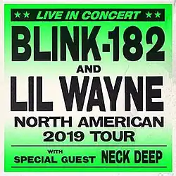 The Blink-182 and Lil Wayne Tour was a co-headlining concert tour by American rock band Blink-182 and American rapper Lil Wayne. The tour was in support of the group's ninth studio album, Nine, as well as Wayne's previously released twelfth studio album, Tha Carter V (2018). The tour began on June 29 in Hartford, Connecticut and concluded on September 16, 2019, in Cincinnati, Ohio. One date coincided with Blink-182's appearance on the Vans Warped Tour 25th anniversary reunion show, as well as at 2019's Riot Fest. Welsh punk group Neck Deep was the opening act on the tour. It was the band's last tour with guitarist/vocalist Matt Skiba before his departure in 2022 upon original member Tom DeLonge's return.