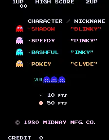 ![]() The original 1980 Pac-Man title screen featuring the four primary ghosts alongside their respective names. Below is how they all appear when they become edible within the game. | |