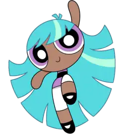 Bliss is taller and has a more developed body than the three younger Powerpuff Girls, with brown skin that is shades darker than would be described as a common tan, purple eyes, and cyan hair. Her dress is purple to match her eyes, much like her three sisters with their own signature color. Since she is different from the other girls, her leggings do not reach all the way down to her feet, courtesy of her being wider and taller. She also has a dark blue plastic headband (a so-called "alice band") that none of the others wear, featuring a fuchsia pink heart.[2]