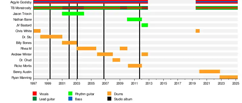 | Past members | Ricko Mortis Del Shannon[4] JV Bastard Jason "J~Sin" Trioxin Billy Bones Dr. Stuart Evilstein Rhea M Andrew "Stripes" Winter[4] Paul Lifeless Nathan Bane Dr. Chud[5] Verden Gravstead Gilby Deviant |