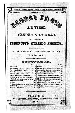 Blodau Yr Oes ("Flowers of the Age") was a 19th-century monthly Welsh-language periodical, first produced in 1872 by T. J. Griffiths, Utica, New York. The full title was Blodau Yr Oes A'r Ysgol. It was aimed at children attending Welsh Sunday schools in America. Its first editors were William ap Madoc and T. Solomon Griffiths. They were later replaced by Calvinist Methodist minister, Morgan Albert Ellis (1832–1901), who had emigrated to the US in 1853, and the Congregationalist minister and Eisteddfodwr Thomas Edwards (bardic name Cynonfardd, 1848–1927).[1][2]