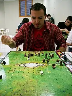Blood Bowl is a two-player, turn-based board game that typically uses 28 mm miniatures to represent a contest between two teams on a playing field. A board containing a grid overlay represents the field. Using dice, cards, and counters, the players attempt to score higher than each other by entering the opponent's end zone with a player who possesses the ball.
