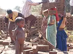 This unequal system between employers and employees within the brick kiln industry is exacerbated by the fact that workers do not receive daily wages, but are paid by a piece work system. This means that the workers receive compensation for every 1,500 bricks made.[7] This system leads to adult, male labourers relying on the help of their family to meet the demand of their employers, and thus, receive sufficient compensation.[8] This model has been criticized for several reasons. Firstly, since wages are paid to the male head of the family, female workers often do not receive compensation, and are consequently reliant on their male family members.[9] Furthermore, this system incentivizes child labour, as households with more members will need to produce more bricks to properly support their families.[3][5] Child labour is also occasionally used as a bargaining power by brick kiln workers, as it is often their only tool to incentivize employers to increase wages or provide additional benefits.[5] Overall, this significantly decreases the attendance of children living on brick kilns to primary school or early childhood care, despite this being a legal obligation of the Indian government. Moreover, this piece work system promotes long hours by workers operating within the brick kiln industry. It has been reported that brick kiln labourers are working approximately 12-hour days, with children workers between the age of five to fourteen working seven to nine hours a day.[5] This system also limits workers ability to attain minimum wage, with many only receiving two to three US dollars a day.[7][3]