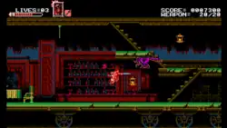 Bloodstained: Curse of the Moon is a 2D side-scrolling platformer that plays and looks similar to Castlevania games on the Nintendo Entertainment System (NES), most notably Castlevania III: Dracula's Curse (1989).[1][2] Like Castlevania III, the game features stages with branching paths that lead to a single boss, and multiple playable characters.[3] The player starts as swordsman Zangetsu, and may recruit up to three other characters as they progress including the whip-wielding Miriam, a magician named Alfred, and the vampire-like Gebel.[4][2] Each character has different weapons, skills, health points, and attack styles that make them more appropriate for different situations.[1][4] The player may switch between these characters instantly at any time.[4][2] If a character dies, they become unavailable for the rest of the level, which may limit the player's ability to explore the remainder of the stage. In such instances, the player can restart the level with all characters again.[4] The player has the ability to enable and disable unlimited lives and the player character is knocked back when hit by an enemy, characteristic of classic Castlevania gameplay.[4] There is also a boss rush mode, and other options to increase game difficulty.[5]