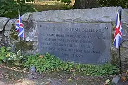 The regulars soon reached a point in the road, now referred to as the "Bloody Angle", where the road rises and curves sharply to the left through a lightly wooded area.[3] At this place, the militia company from Woburn had positioned themselves on the southeast side of the bend in the road in a rocky, lightly wooded field. Additional militia flowing parallel to the road from the engagement at Meriam's Corner positioned themselves on the northwest side of the road, catching the British in a crossfire, while other militia companies on the road closed from behind to attack. Some 500 yards (460 m) further along, the road took another sharp curve, this time to the right, and again the British column was caught by another large force of militiamen firing from both sides. In passing through these two sharp curves, the British force lost thirty soldiers killed or wounded, and four colonial militia were also killed, including Captain Jonathan Wilson of Bedford, Captain Nathan Wyman of Billerica, Lt. John Bacon of Natick, and Daniel Thompson of Woburn. The British soldiers escaped by breaking into a trot, a pace that the colonials could not maintain through the woods and swampy terrain. Colonial forces on the road itself behind the British were too densely packed and disorganized to mount more than a harassing attack from the rear.[4]