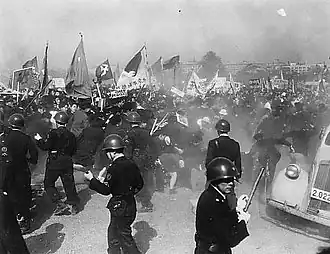 Bloody May Day (血のメーデー事件, Chi no mēdē jiken) refers to a violent conflict that took place between protesters and police officers in the Kokyo Gaien National Garden in front of the Imperial Palace in Tokyo, Japan, on May 1, 1952. When a large crowd protesting the U.S.—Japan Security Treaty refused to disband, a bloody melee took place between protesters and police officers. Eventually the police officers opened fire on the crowd, killing 2 and injuring 22 with bullet wounds.[1] Altogether, around 2,300 people (1,500 protesters and 800 police officers) were injured in the fighting.[2]