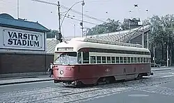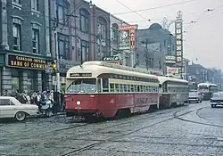 On October 12, 1938, twelve PCC streetcars were introduced on the Bloor line replacing twelve trailers. By November 5, all trailers had been replaced by PCCs. By December 1, PCCs provided all Bloor line service.[5]: 40
