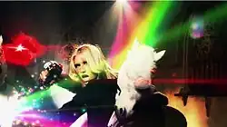 "Blow" was performed on television for the first time on April 22, 2011, for the Nickelodeon show Victorious episode "Ice Cream for Ke$ha."[40] The storyline for the episode saw the show's stars competing in a contest to win a private concert by Kesha. In order to win the contest the cast had to spell out Kesha's name through letters found at the bottom of ice cream containers.[41] Kesha's younger brother, Louie Sebert also guest starred in the episode.[42] "Blow" was performed live on May 22, 2011, at the 2011 Billboard Music Awards. The performance was opened with "Animal" as Kesha sang suspended over the stage in a structure shaped like a diamond. Midway through the performance she dropped backwards into her crowd of background dancers then transitioned into "Blow". The performance featured glitter cannons and the dancers wore orange unicorn heads.[43] It was also used in an advertisement for the then-upcoming season of The Real World: Las Vegas on MTV.