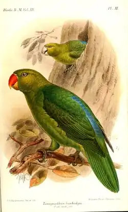 It was previously conspecific with the azure-rumped parrot (T. sumatranus), but was split as a distinct species by the IUCN Red List and BirdLife International in 2020, and the International Ornithological Congress followed suit in 2022.[4][5] It can be differentiated from the azure-rumped parrot by its blue back and red iris vs. the azure-rumped parrot's yellow iris and plain green back.[6]
