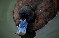 The tail feathers for both the male and female are made up of thick, spine-like shafts. The tail is usually held flat on the surface of the water, or held erect when defensive. The male also holds the tail erect during courtship displays. The feet are quite powerful, which aids in swimming and diving. The duck sits low in the water in comparison to other ducks.[2] During breeding season, apart from the aforementioned bright-blue bill, the male's head and neck are glossy black, and the back and wings are a rich chestnut. During the non-breeding season, the head changes from its glossy black to black with grey speckles, and its body changes from chestnut to dark grey.[2] Some males retain breeding plumage throughout the year.[3] The female's plumage does not change throughout the year. Its head is dark brown, and the back and wings consist of black feathers with a light-brown tip, giving a mottled appearance, although the National Parks and Wildlife publication[5] on O. australis refers to bands on each feather rather than a single feather-tip colouration. The female blue-billed duck has a dark grey-brown bill and grey-brown feet, while the male's feet are grey. Both males and females have brown irises. Juvenile blue-billed ducks have a resemblance to adult females but appear paler and have a grey-green bill.