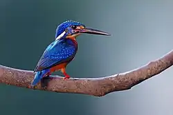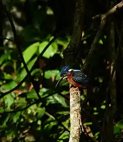 The blue-eared kingfisher (Alcedo meninting) is found in Asia, ranging across the Indian subcontinent and Southeast Asia. It is found mainly in dense shaded forests where it hunts in small streams. It is darker crowned, with darker rufous underparts and lacking the rufous ear stripe of the common kingfisher (Alcedo atthis) which is found in more open habitats. A number of subspecies have been described that differ in measurement and colour shade. Adult males have an all dark bill while females have a reddish lower mandible.