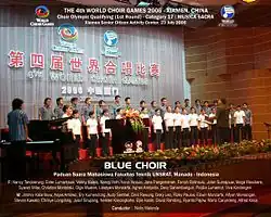 | 2006 | 4th World Choir Games[2] | Musica Sacra | Golden Diploma (1st Round), Silver Medal (2nd Round)[2] | Xiamen, People's Republic of China |