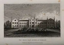 Thomas Henshaw, who died in 1810, left the sum of £40,000 (£3.6 million as of 2023)[3] for the endowment of the Blue Coat School.[4] The estate was tied up in litigation for many years but was eventually released. As no provision had been made for the cost of the building, a public meeting was held in Oldham in September 1825, when offers of land were received, and a public appeal was launched for funds to build the school. From the design of the architect Richard Lane, a start was made in 1829 when the foundation stone was laid, and the school was opened in 1834. Throughout the remainder of the 19th century, the school continued to maintain and instruct between 100 and 130 boys.