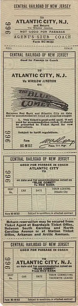 Designed by CNJ president R.B. White in 1928, this train whisked passengers from Communipaw Terminal in Jersey City to Atlantic City, making the total trip from Manhattan (via ferry to the Jersey City terminal) to Atlantic City in three hours. The Blue Comet would travel via the CNJ-co-owned New York and Long Branch Railroad to Red Bank, then follow the CNJ Southern Division Main Line to Winslow Junction, where it would travel over the Atlantic City Railroad's tracks to Atlantic City.[1]