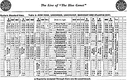The Blue Comet offered extra accommodations at the regular coach fare and assigned seats so passengers knew exactly where they would sit. The PRR charged extra for its all-parlor car Atlantic City Limited and the New York Limited. In addition, the railroad charged extra fees for parlor cars on the Nellie Bly. The Blue Comet ran on-schedule 97 percent of the time for its first five years.[3] A billboard was installed on Routes 33 and 34 overpass at Farmingdale listing the times the train would pass that area.