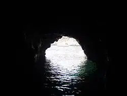 Depending on the season, the ideal moment to visit the cave is between 11 AM and 12 noon.[2][3] At this time of day the sunlight reflects through the water coming from the white floor of the cave and bathes the grotto in aquamarine light, while objects in the water appear to be silver.[4] The Blue Grotto (Italian: Grotta Azzurra) on the island of Capri in Italy is also famous for this type of phenomenon.