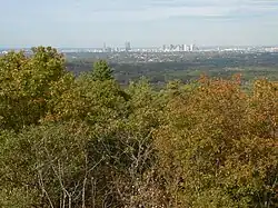Blue Hills Reservation is a 7,000-acre (2,800 ha) state park in Norfolk County, Massachusetts in the United States. Managed by the Massachusetts Department of Conservation and Recreation, it covers parts of Milton, Quincy, Braintree, Canton, Randolph, and Dedham. Located approximately ten miles south of downtown Boston, the reservation is one of the largest parcels of undeveloped conservation land within the Greater Boston metropolitan area. The park's varied terrain and scenic views make it a popular destination for hikers from the Boston area.[2]