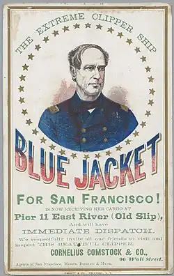 The Blue Jacket was an 1854 medium clipper well known for the lavish decoration of its staterooms and saloon. She served in the Liverpool and Australia trades.[3]: 173 The ship was named after the blue jackets, a traditional name for sailors in the US and British navies.