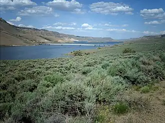 The centerpiece of the plans for the Gunnison was the construction of four dams on a 40-mile stretch (64 km) of the river east of the National Park Service's Black Canyon of the Gunnison National Park, projects that would not only help control the amount of water flowing into the Colorado, but would also create new opportunities for flood control, water storage, and the generation of hydroelectric power.[4] The first of these dams was Blue Mesa Dam, which was begun in 1962 approximately 30 miles (48 km) west of Gunnison, and 1.5 miles (2.4 km) west of Sapinero. Finished four years later, the dam created Blue Mesa Reservoir, which became the primary water storage reservoir for the Curecanti Unit (later renamed the Wayne N. Aspinall Unit).[5]