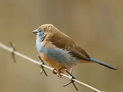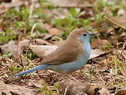 The blue waxbill (Uraeginthus angolensis), also called southern blue waxbill, blue-breasted waxbill, southern cordon-bleu, blue-cheeked cordon-bleu, blue-breasted cordon-bleu and Angola cordon-bleu, is a common species of estrildid finch found in Southern Africa. It is also relatively commonly kept as an aviary bird.[2]