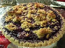 Blueberry pie is a pie with a blueberry filling. Blueberry pie is readily made because it does not require pitting or peeling of fruit. It usually has a top and bottom crust. The top crust can be circular, but the pie can also have a crumble crust or no top crust. Blueberry pies are often eaten in the summertime when blueberries are in season in the Northern hemisphere.[3]