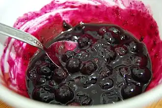 Sweet blueberry sauce, also called blueberry compote, may be used as a dessert sauce.[11] Blueberries and water provide the base for the sauce,[12] but beyond that recipes vary. A sweetener such as sugar is typically used, and lemon juice, orange juice, butter and corn starch are sometimes added.[2][13][10][14][15] A spiced version can be made using cloves, cinnamon and cardamom.[16] Sweet blueberry sauce can be used in or to top desserts such as cheesecake, cake, and ice cream, and on breakfast dishes such as pancakes, waffles and French toast.[17][5][16][18] It can also be used to create a blueberry fool.[19]