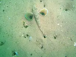 The bluefin gurnard's large, fan-like pectoral fins are one of two pairs with 13-14 soft rays and its pelvic fin has 5 soft rays and a single spine. The pectoral fins' first three rays are modified and separated from the rest of the fin. They are used as sensory organs, sometimes referred to as "fingers",[8] permitting it to probe the sea bottom to detect prey buried in the sand or the mud[7][9] These spectacular fins make the red gurnard look like a butterfly of the sea, however their role is not entirely known. They could be used to attract a mate or frighten off predators.[7] These fan-like fins can also be used to give stability during swimming.[9]