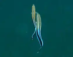 The bluestreak cleaner wrasse (Labroides dimidiatus) is one of several species of cleaner wrasses found on coral reefs from Eastern Africa and the Red Sea to French Polynesia. Like other cleaner wrasses, it eats parasites and dead tissue off larger fishes' skin in a mutualistic relationship that provides food and protection for the wrasse, and considerable health benefits for the other fishes.[3][4][5] It is also notable for having potentially passed the mirror test, though this is not without controversy.[6][7][8][9]
