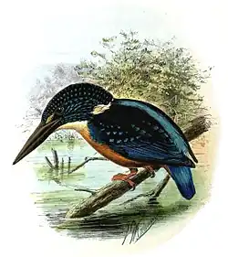 Blyth's kingfisher was described by the English zoologist and curator at the Asiatic Society of Bengal Edward Blyth in 1845 and given the binomial name Alcedo grandis.[2][3] Unfortunately, this name was preoccupied as it had already been introduced for another species by the German naturalist Johann Friedrich Gmelin in his Systema naturae of 1788.[4][5] In 1917, the German naturalist Alfred Laubmann proposed the substitute binomial name Alcedo hercules to replace the preoccupied name.[6] Blyth's kingfisher is most closely related to the blue-eared kingfisher (Alcedo meninting).[7] The species is monotypic.[8] It has also been referred to as the great blue kingfisher.[9]