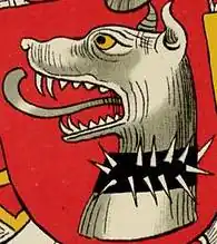 Formal the Mosbach line changed its coat of arms to obscure its aristocratic ancestry to a black, smooth-haired Rüde pointing upwards towards the jump with open mouth, craving red tongue and tail curved over itself on a yellow or golden escutcheon with a frog-mouth helm.[41][42]