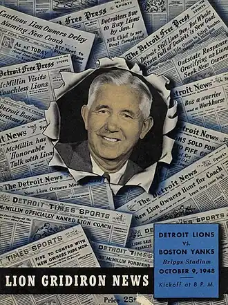 Despite becoming the school's athletic director and earning apparent lifetime security, with seven years remaining on his most-recent contract the 53-year-old McMillin sought new challenges after the 1947 season.[60] He accepted a five-year contract to coach the National Football League's Detroit Lions on February 19, 1948.[61]