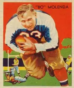 John Joseph "Bo" Molenda (February 20, 1905 – July 20, 1986) was an American football player and coach. He played primarily a fullback, in college at the for the University of Michigan and for nine seasons in the National Football League (NFL) with the New York Yankees, the Green Bay Packers. and the New York Giants. Moldena played for two Big Ten Conference championship teams at Michigan and four NFL championship teams, three with the Packers and one with the Giants. Molenda was the backfield coach for the Packers in 1947 and 1948, as has the same with the Chicago Hornets of the All-America Football Conference (AAFC) in 1949. He served as the head football coach at Menlo College, then a junior college, located in Atherton, California, from 1950 to 1969.