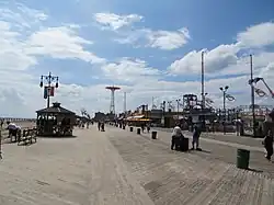 In the 19th century, seaside living and entertainment became popular. Primarily in the Jersey Shore coastal region of New Jersey, United States, walks made of boards (hence the name 'boardwalk') began to be placed among seaside hotels and other establishments so as to prevent beach sand from being tracked into the buildings. These structures were not initially permanent, being taken down in the fall and then replaced the following spring, but eventually permanent boardwalks began to be placed.[2] These boardwalks eventually expanded to become wider and taller to account for pedestrian traffic, and railings were added to make them safer. As the areas became more developed, more businesses began to move into boardwalk districts, and eventually amusement rides such as the carousel came to larger boardwalks. By the beginning of the 20th century, boardwalks had become destinations unto themselves, with events such as Easter parades becoming mainstays of the boardwalks.[5] Many early boardwalk towns advertised themselves as health resorts, as physicians of the time believed that seawater had medicinal properties.[6] In the mid-20th century, however, the popularity of boardwalks began to decline due to a combination of competition from other dedicated theme parks such as Disneyland and hurricanes attacking the outdated boardwalk infrastructure. As a result, the boardwalk lost some of its popularity.[5] Regardless, boardwalks such as the Atlantic City Boardwalk in New Jersey, Coney Island in New York, or the Kemah Boardwalk in Texas remain popular tourist attractions to this day.[7]