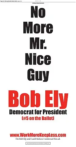 Ely filed for the January 2012 New Hampshire Democratic primary in 2011.[9] To spread his message, he bought space in local newspapers and sent out 145,000 mailers to homes throughout New Hampshire, asking, "Are you pissed-off enough to vote for a jerk?" For the primary, he told The Portsmouth Herald that he had spent $200,000 of his own money,[3] including the $1,000 filing fee.[10] Among the field of 14 candidates on the ballot, Ely finished seventh with 287 votes for 0.47 percent of the total.[11] In additional primaries, his numbers steadily improved. At the March 6 Oklahoma primary, for which he paid $2,500 to appear,[12] he finished in fifth place with 5,318 votes for 4.72 percent.[13] At the March 24 Louisiana primary, whose filing fee was $1,125,[14] he came in third, behind only Obama and attorney John Wolfe, Jr., and won 9,897 votes for 6.57 percent.[15] After this, his strongest showing, Ely sent out a letter, later published by Politico, which explained that in Louisiana without buying any advertisements or campaigning, he was able to win 120 voting precincts and out-paced President Obama in 457 precincts. He speculated that "most [of the votes] came from those who concluded 'I’ve never heard of this guy so he can’t be any worse than the rest of these clowns.' It seems a strange indictment of our political establishment that obscurity becomes an asset."[16]