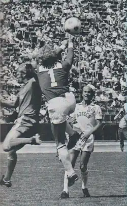In 1973, Philadelphia Atoms coach Al Miller, an alumnus of East Stroudsburg University, took Rigby as the first pick in the 1973 NASL college draft. Miller was building his team for the Atoms, which were an expansion franchise that year. Miller had watched Rigby play and was familiar with his excellent athleticism and technical ability. Rigby did not disappoint Miller. He set a league record of 0.62 goals allowed as a rookie that stood until the end of the league. That year, Philadelphia became the first U.S. professional team in any sport to win a championship their first year in existence.[2] Rigby became a local and league hero and found himself on the cover of the September 3, 1973 Sports Illustrated, the first soccer player to be so honored. Rigby continued to provide positive exposure to the young NASL when he took fourth place in ABC's 1976 Superstars, a televised athletic competition pitting athletes from various sports. February 1974 saw Rigby involved in another significant first. The NASL was toying with the idea of indoor soccer and the Atoms hosted the Red Army of Moscow team in Philadelphia's Spectrum. This was one of the first indoor games to use the configuration familiar to future indoor leagues, an astroturf-covered ice rink with small goals set into the far walls. While the Red Army team won, 6–3, its coach had high praise for Rigby who had stopped 33 of the Soviets' 39 shots.[3]