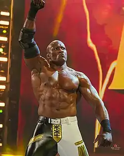 In September 2024, Lashley signed with All Elite Wrestling (AEW).[208] He made his debut at Fright Night Dynamite on October 30, where he attacked Swerve Strickland and reunited with former Hurt Business members MVP and Shelton Benjamin, who reformed the group under the new name "The Hurt Syndicate", establishing himself as a heel in the process.[209] On the November 20 episode of Dynamite, Lashey made his AEW in-ring debut, where he defeated Cheeseburger and Joe Keys in a two-on-one handicap match.[210] On November 23 at Full Gear, Lashley defeated Strickland.[211]