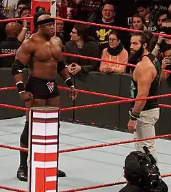 At The Shield's Final Chapter event on April 21, Lashley teamed with Baron Corbin and Drew McIntyre to face The Shield in a losing effort.[110] Lashley then feuded with Braun Strowman, culminating in a match between the two at Super ShowDown on June 7,[111] which Lashley lost.[112] On the June 17 episode of Raw, Strowman eliminated Lashley from a fatal five-way elimination match for an opportunity at the United States Championship; Lashley in turn helped in getting Strowman eliminated.[113] The following week, Lashley attacked Strowman after losing a tug of war match.[114] A falls count anywhere match on the July 1 episode ended in a no contest after Strowman tackled Lashley through the LED video wall of the entrance and both were taken to a local hospital.[115] Following this, the two were scheduled for a Last Man Standing Match at Extreme Rules on July 14,[116] which Lashley lost, thus ending their feud.[117]
