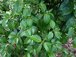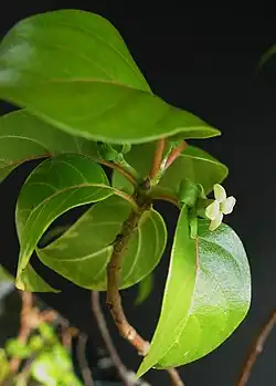 The perennial tree is around 30 feet tall. The simple leaves are opposite. The drupe fruit is purplish to black in color. The flower color ranges from greenish to yellowish to white. It can bloom any time of the year.[4] 1 to 7 flowers are at the base of the leaves. The smooth bark is gray and scaly. The inner bark is light brown and bitter. The twigs are light brown and has tiny hairs. The leaves have pink hairy leafstalks. The upper surface of the leaves is shiny green with pinkish midveins and curved side veins. The round fruit is slightly shiny and has tiny hairs. The fruit contains 2-6 nutlets, and each nut has one seed.[5]