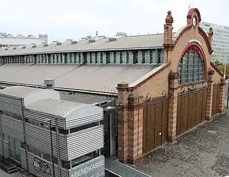 The main building of the depot once served as a shed for trams. It was built in 1900 with three naves of yellow bricks with red cornices and decorations. The wooden roof construction goes back to models of the French Renaissance builder Philibert de l'Orme and has become rare.[3][9] As a theatre venue, the hall now seats around 400 people.[2] The depot is a listed monument according to Hessian law.[9]