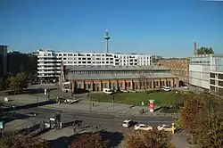 The tram tracks remained until about 1986. All supporting structures were then demolished to make room for parking lots. The hall was occasionally used for events, such as performances of the Circus Roncalli in 1986. When the opera house was damaged by fire in November 1987, the Frankfurt Opera began to use the play theatre, and a new venue was needed for plays.[2] In 1988, the Bockenheimer Depot was rebuilt as a theatre, designed by Klaus Peter Heinrici. An adjacent building was erected as a steel construction, and a square created in front of the historic hall.[2]