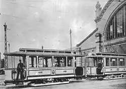 Before 1900, a wooden hall existed here for the cars of the horse-drawn trams.[2] Since it was not suitable for the new electric trams, it was demolished in 1900 and replaced by the current building, with an added wooden structure to house the main workshop for the trams (Hauptwerkstatt).[2]