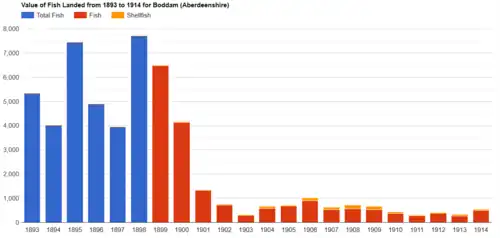 A marine villa, known as the Earl's Lodge, was built in 1840 for George Hamilton-Gordon, Earl of Aberdeen (later Prime Minister) and in 1842 he initiated construction of the second harbour situated next to the first, leading to a considerable increase in the local fishing industry and Registered Port status in 1845. By the mid-1840s the population of the expanded and improved village had grown to 526 inhabitants, with 22 haddock boats and 23 larger herring boats working from the harbour for the seasonal fisheries (March to July, and July to September respectively). 12 boats were employed during the winter months in the cod and white fisheries.[7][8]