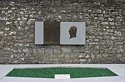 In October 1969, the Tones' tomb was bombed and damaged by the Ulster loyalist UVF.[10] In June 1975, the same group sought to derail a train at near Sallins carrying 250 Official IRA supporters to the annual commemoration, and murdered a witness to their attempt, a local farm labourer, Christopher Phelan.[11][12] In 2013, the Tone's headstone was replaced with a tomb of Irish limestone and, overlooking it on a church wall, a bronze relief portraying Tone in profile next to an excerpt from Pearse's 1915 eulogy.[10]