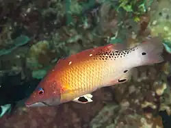 Bodianus dictynna, is a species of wrasse native to tropical and warm temperate waters of the Western Pacific,[2] from the Indo-Malaysian Archipelago east to Tonga, as far north as Japan and as far south as Australia. It is most frequently recorded in association with living coral reefs and the juvenile fish usually occur near black coral and gorgonians, although they sometimes are found in caves near the ceiling. It feeds mainly on benthic invertebrates such as molluscs and crustaceans. The juveniles regularly behave as cleaner fish, removing parasites from other fish.[3] The specific name dictynna is an alternative name for Diana, the Roman goddess of hunting, and refers to the close relationship between this species and Bodianus diana of the Indian Ocean, and a proposed common name of Pacific Diana's pigfish also reflects this relationship.[4]