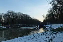 Until the middle of the 19th century, the Elster-Pleiße floodplain was regularly inundated by floods.[13][14] According to a project by the Leipzig hydraulic engineers Kohl and Georgi from the years 1852 to 1854, the flooding of the Elster and the Pleiße was subsequently changed. For the Pleiße, the Pleiße flood channel was created from the Connewitz weir to the Elster in the area of today's Palmengarten weir, into which the Elster flood channel was later integrated at the Leipziger Eck and has been called that from there ever since.