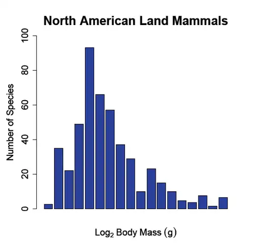 The body size-species richness pattern (see fig. 1) has been documented for land mammals across numerous continents such as North America, South America, Eurasia and Africa (Brown and Maurer, 1989;[5] Bakker and Kelt, 2000;[6] Maurer et al. 1992[7]). Traditionally the pattern has been explored by plotting the number of species on the y-axis and the logarithm to the base two of the species body mass (g) on the x-axis. This yields a highly right skewed body size distribution with a mode centered near species with a mass ranging from 50-100 grams. Although this relationship is very distinct at large spatial scales, the pattern breaks down when the sampling area is small (Hutchinson and MacArthur, 1959;[1] Brown and Maurer 1989;[5] Brown and Nicoletto 1991;[3] Bakker and Kelt 2000[6]).