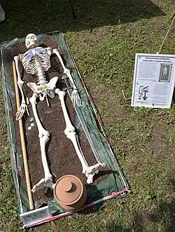 Anthropological research at the Nicolaus Copernicus University in Toruń determined that 14 of the recovered remains were male, and 21 were female. Bone deterioration of 17 remains was too severe for sex to be determined.[26] Further research determined that 74% of the population in the necropolis were adults.[27] The underrepresentation of children is atypical of burial grounds from the Middle Ages.[27] Women exhumed from the cemetery were, on average, aged between 20 – 30 years, whereas the men were between the ages of 40 – 50.[28] Lipinska and Kozlowski believed that the discrepancy between the ages of men and women was due to complications in female pregnancy, which reduced average life-span.[29]