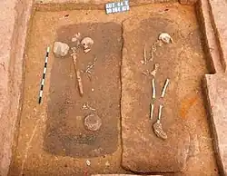 The excavation uncovered 52 human skeletons spread across 58 chamber graves.[22] Some graves had no evidence of skeletal remains, either due to poor preservation, or because the chambers were used as cenotaphs.[23] The nature of soil composition in some parts of the cemetery resulted in the leaching of calcium carbonates, which caused the human remains to become soft.[24] Skeletal remains were better preserved in areas where the soil was less permeable.[24] All uncovered remains did show a high degree of deterioration, especially those of young people, and those buried in shallow graves.[25]