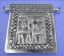Three silver kaptorgi were found at the site.[72] These are small boxes that are associated with magic and ancient ritual.[73] They often contained amulets, precious items, or plant materials that were used to protect against evil.[74] Two of these were decorated with a unique eagle design, the third was very poorly preserved.[75] The eagle depicted on two of the kaptorgi did not have talons, which is a motif that has appeared in Merovingian and Anglo-Saxon cultures.[76] Eagles were a common powerful motif in Roman, Greek, Scandinavian, Rus and Germanic cultures, though these depictions usually contained talons.[76]