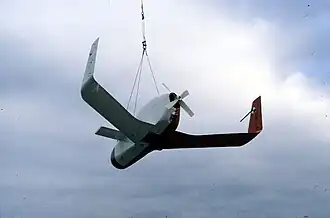 The CQM-121 program began in 1983, with Boeing being awarded a contract for the development of a small drone aircraft that was intended for the suppression of enemy air defenses.[1] The resulting YCQM-121A, given the code name "Pave Tiger", was a tailless aircraft powered by a two-stroke engine.[2] The drones were to be fitted in 15-cell containers with wings folded; the sides of the container would open to allow for launch on a rail using a solid-fuel rocket booster. The aircraft would then follow a pre-programmed route, and could either use electronic countermeasures to suppress air defense systems, or use a small warhead to directly destroy them.[3]